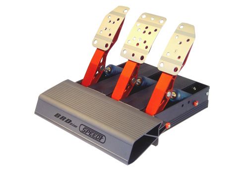 Det nyeste pustet med liv fikk jeg i fjor sommer, som er et sett med tre pedaler (BRD Speed 7) der man kan individuelt justere motstanden de yter mot føttene. Dette er mest av hensyn til bremsepedalen, som faktisk ikke er spesielt vanskelig å trykke ned på de fleste pedalsett og dermed heller ikke spesielt realistisk. Dessuten kan det være en fordel å kunne benytte seg av en clutchpedal en gang i blant. Jeg fant ganske kjapt ut at det å kjøre på sokkelesten ikke lenger var like aktuelt, da kantene på pedalene er noe skarpe og av kuldeledende metall. Vanlige sko duger jo ikke, siden sålene er altfor tykke, så jeg tok det helt ut og fant et billig par med skikkelige kjøresko beregnet for go-kart med feriepengene. De passer i tillegg fint som innesko, så da kunne jeg trekke kortet med god samvittighet!